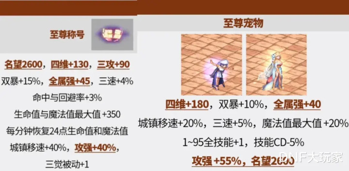 〔至敬名称〕四维+130、三攻+90、全属强+45、攻强+40%、名望值2600点!〔至尊宠物〕四维+180、全属强+40、攻强+55%、名望值2600点。